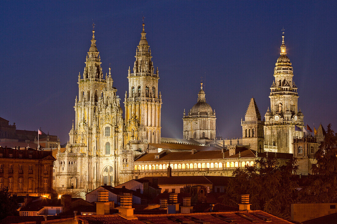 The cathedral is a huge baroque-style building that commands multiple city blocks. Walking around it, with its four squares, takes a bit of time and offers not only different perspectives of the building but of the city as well. I wondered; would any pilgrims be found at this late hour? Would the cathedral be ablaze in modern artificial light?